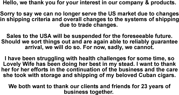 PRICES: All prices are in US funds on International pages, and Cdn funds on the AB Resident pages (which also include the max of $8.61 tobacco tax per Cuban cigar. Sad but true, sigh... It is the customers responsibility to pay any taxes or duties that may be required for their specific locale. It is important that while we are happy to follow your shipping request instructions, you must be responsible for complying with any local laws and regulations within your area. To our valued Canadian Customers. Due to Federal Tobacco regulations in Canada, we are not permitted to ship to consumers in other Provinces within Canada. (Yes, really... no kidding)